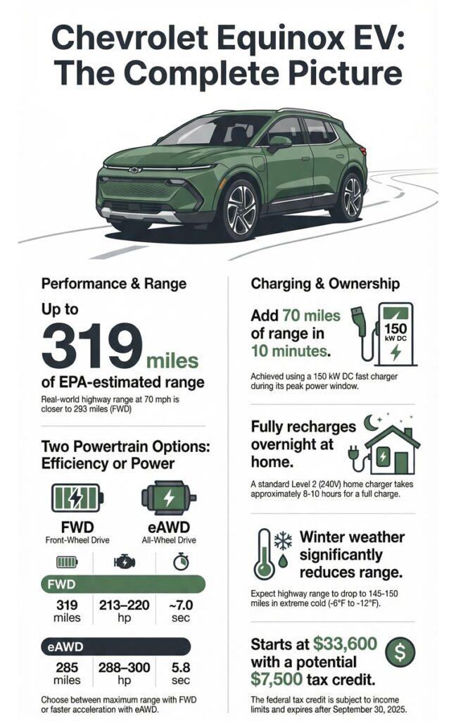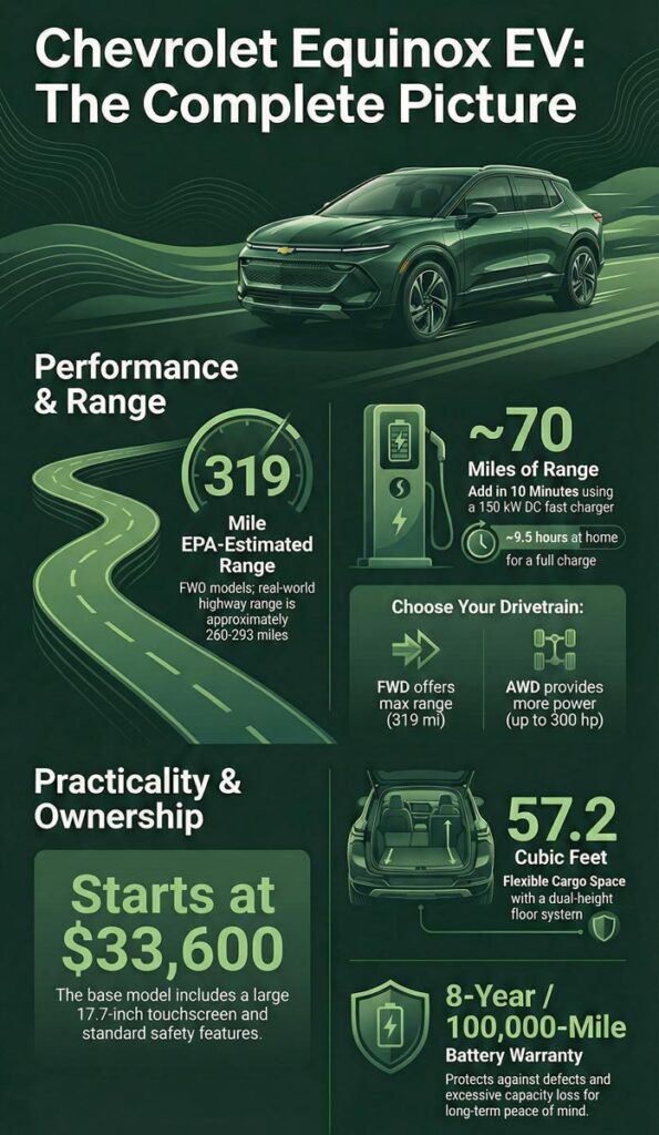 When you’re shopping for an electric SUV, you’re basically asking three questions: how far will it go, how quickly will it get there, and can it handle the road without feeling like a compromise. The Equinox EV answers all three decisively.